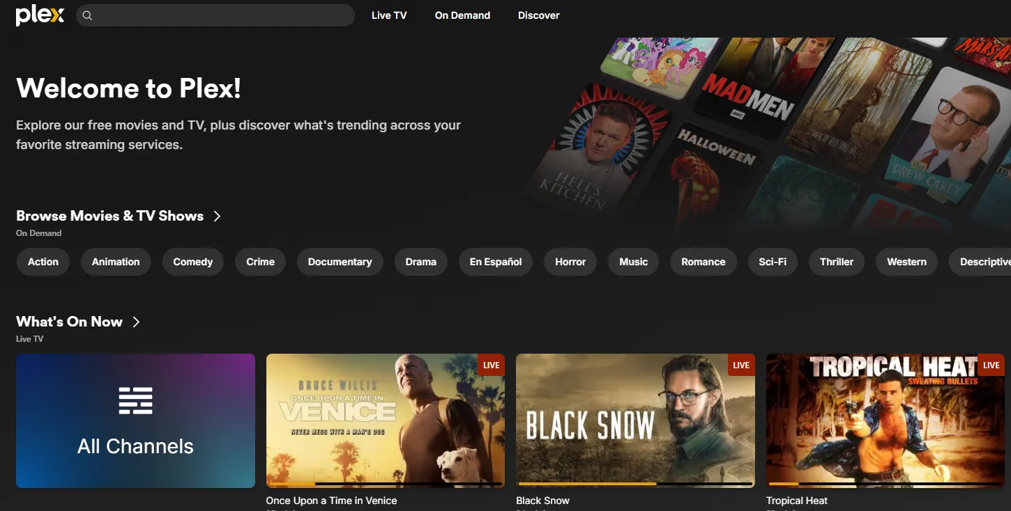 Plex started as a personal media server app that lets you organize and stream your own movie collection. In recent years, it has evolved into a full-fledged free streaming platform — offering over 600 live channels and thousands of on-demand movies and TV shows, all completely free. It's the only service on this list that combines free ad-supported streaming with the ability to host your own media library.