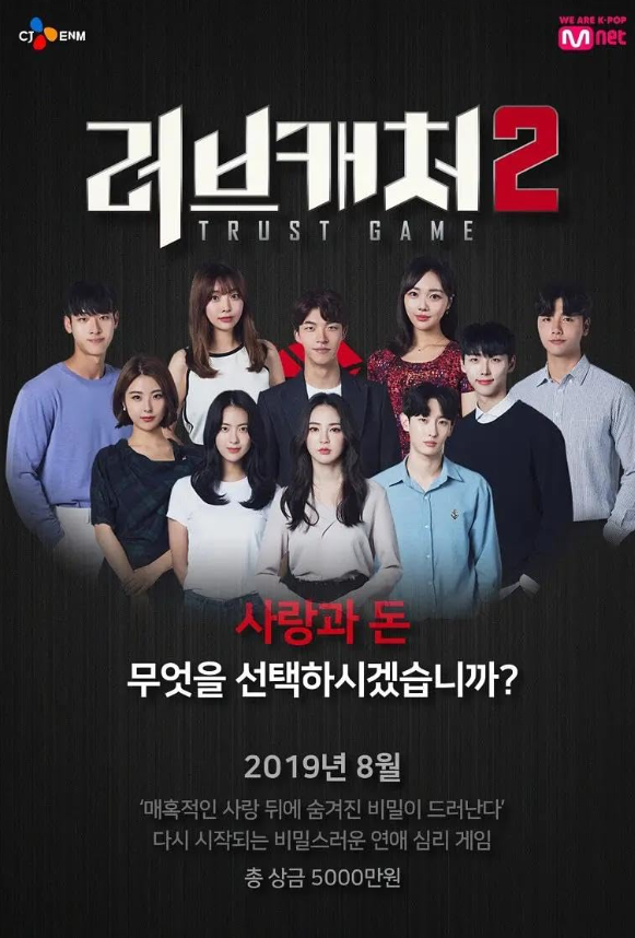 | Love Catcher | 2018–2019 (2 seasons) | Love vs. Money Psychological Thriller | Shin Dong-yup, Hong Suk-chun, Jang Do-yeon, JR (NU‘EST) | 5 men + 5 women; some are “Love Catchers” (genuine love), others “Money Catchers” (¥50M prize) | ABEMA / KOCOWA |