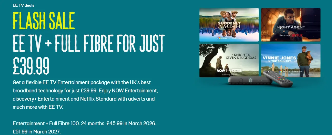 | EE | EE TV Full Works | ⚠️ Optional / Add-on | ~£60/month | ~150 Mbps | 24 months | Flexible add-ons, Apple TV integration, mobile + TV bundles | Existing EE mobile customers |